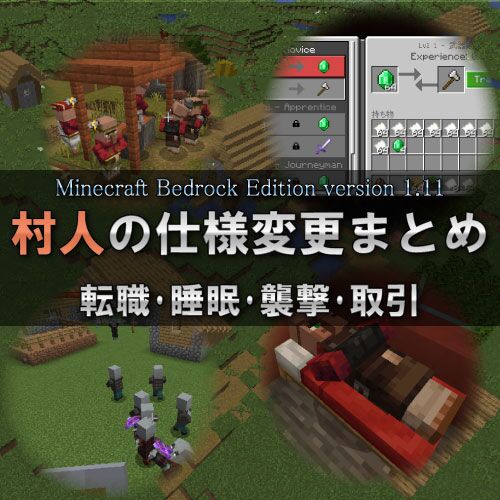 どうも!パイセンです。 マイクラ(マインクラフト)BE(Bedrock Edition)では、バージョン1.10、1.11から村人の仕様がガラっと変わります! 転職したり、睡眠を取ったり、時には襲撃されたり・・・。とにかくほぼ全部が変わってしまったため、仕様変更につ…