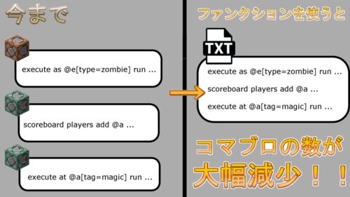 JavaEdition(PC版)のver.1.12から「ファンクションシステム」が導入されてます。 コマンドを打つ人からしたら、ほぼメリットしかないのですが、そうじゃない人からすると、「ファンクションファンクションってなんやねん・・・。」と思うことでしょう(フ…